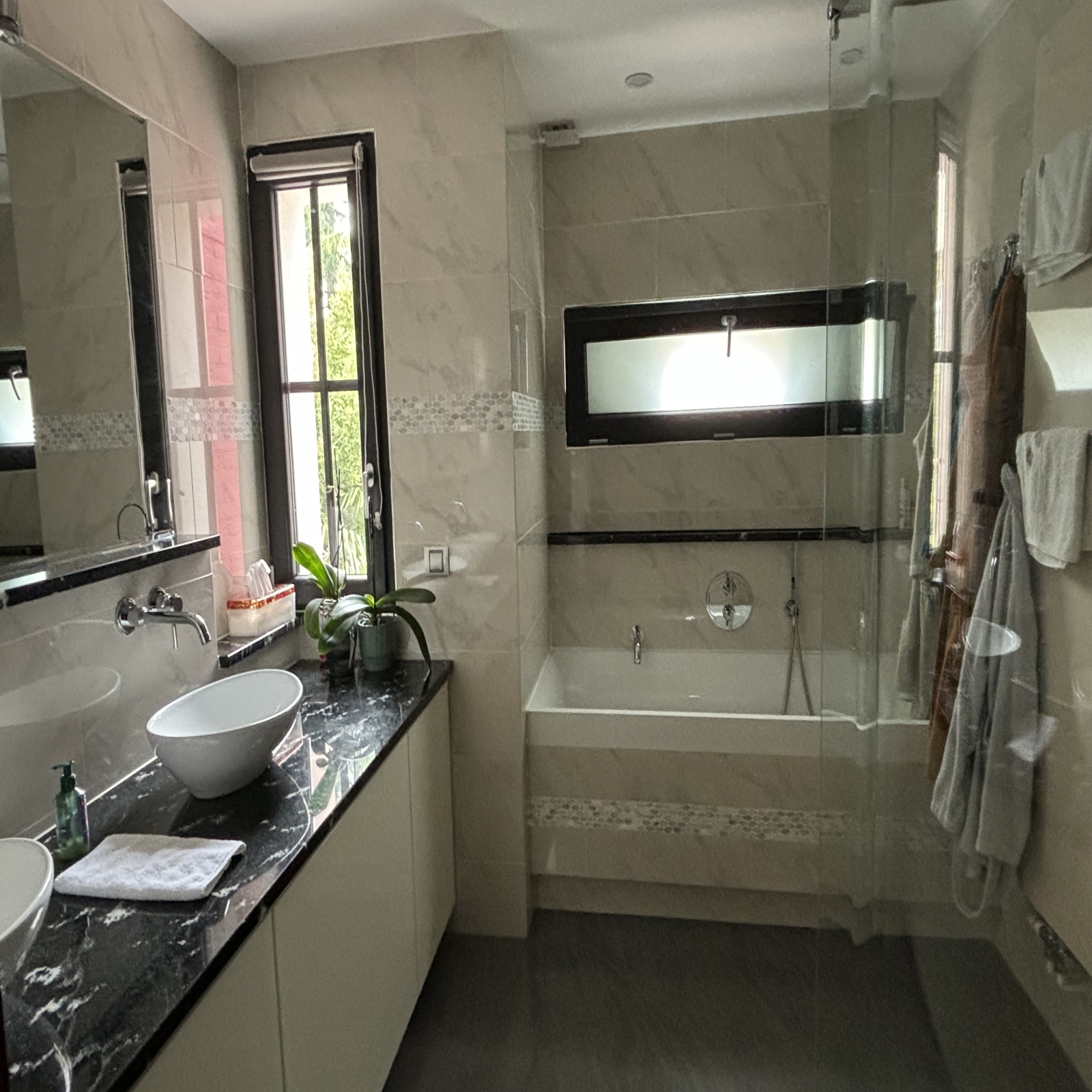 Elle se compose d’une entrée avec dressing, d’un espace de réception comprenant le salon, la salle à manger et la cuisine de 52 m2, l’ensemble de plain-pied sur le jardin et sur une terrasse dinatoire attenante à la cuisine, wc.