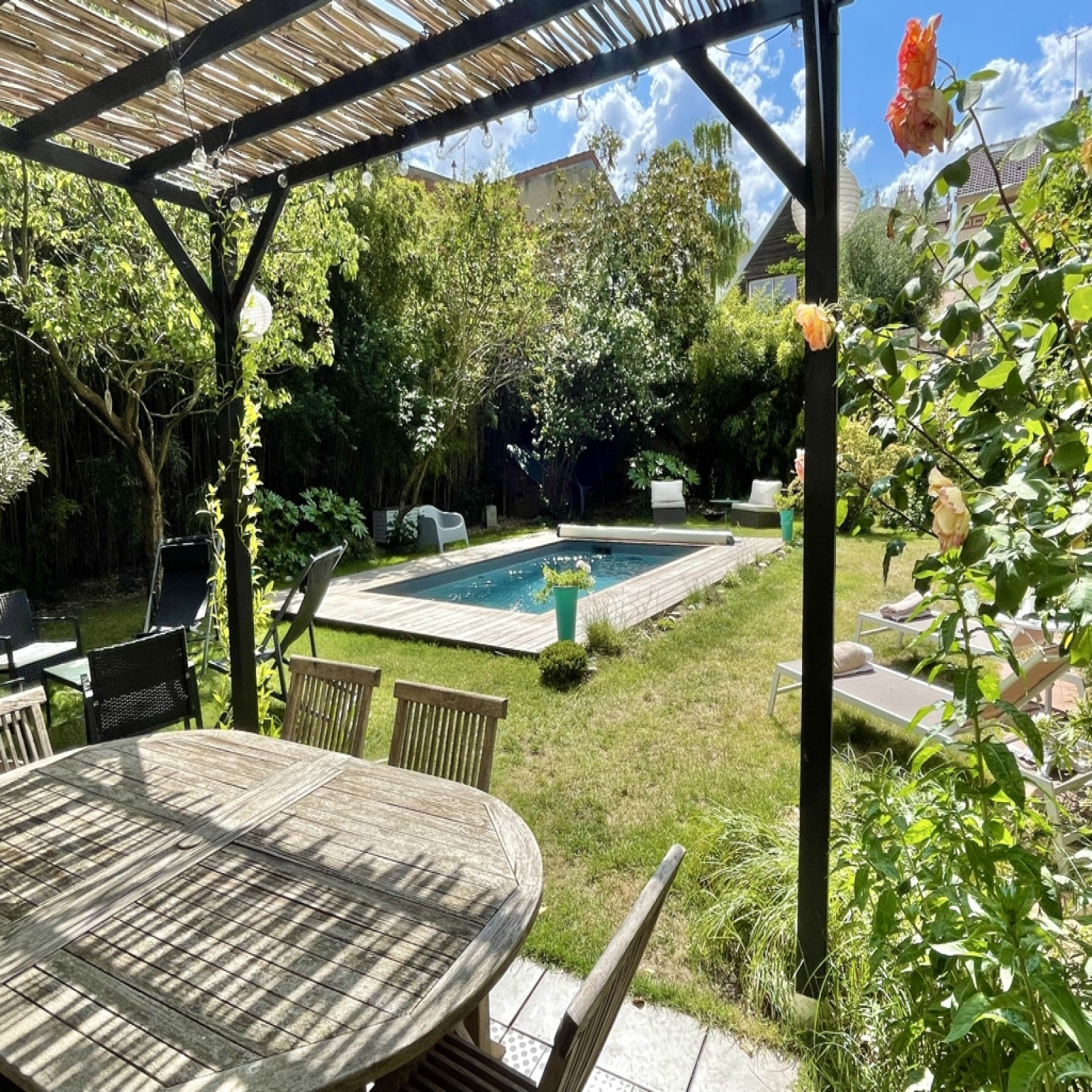 VENDUE - EXCEPTIONNELLE, PETITE GARENNE à moins de 4 mn de la gare de la Garenne Colombes et des commerces, du T2 pour la Défense, Cette ravissante maison 1930 de 140 m2 nichée dans la nature, au calme, a des allures de maison de vacances avec son grand terrain accueillant la PISCINE (chauffée et jet à conte-courant), Ses espaces détentes et dinatoires au milieu de la végétation. Elle est composée d?un double séjour lumineux avec une cheminée, d?une salle à manger et d?une belle cuisine, l?ensemble de 53 m2, ouvert mais séparé néanmoins harmonieusement par des jeux de verrières. 4 chambres, un bureau ou 5ème chambre, d?une salle de bains, d?une salle de douche, de 2 wc. Une buanderie (ancienne cuisine), pièce de rangement. Possibilité de garer une voiture à l?extérieur et de louer un parking (80€) à proximité. Pas de travaux, décoration soignée, chaudière neuve, toit révisé en 2022, Piscine de 2021 (peu d?entretien et faible dépense électrique grâce à la pompe à chaleur) A moins de 10 mn du centre de la Garenne-Colombes, de son marché réputé. Groupe scolaire Léon Bourgeois à 7 mn à Pied.