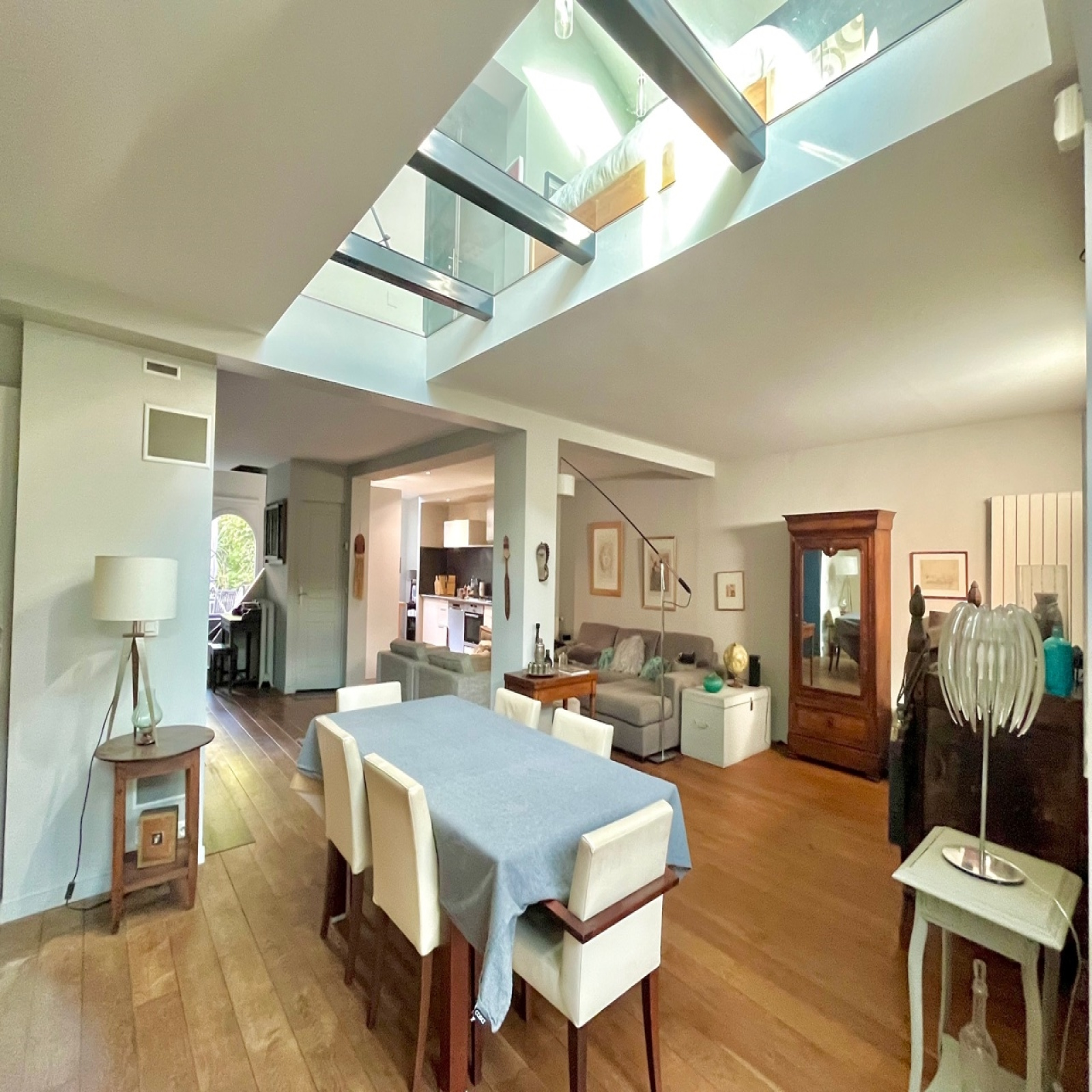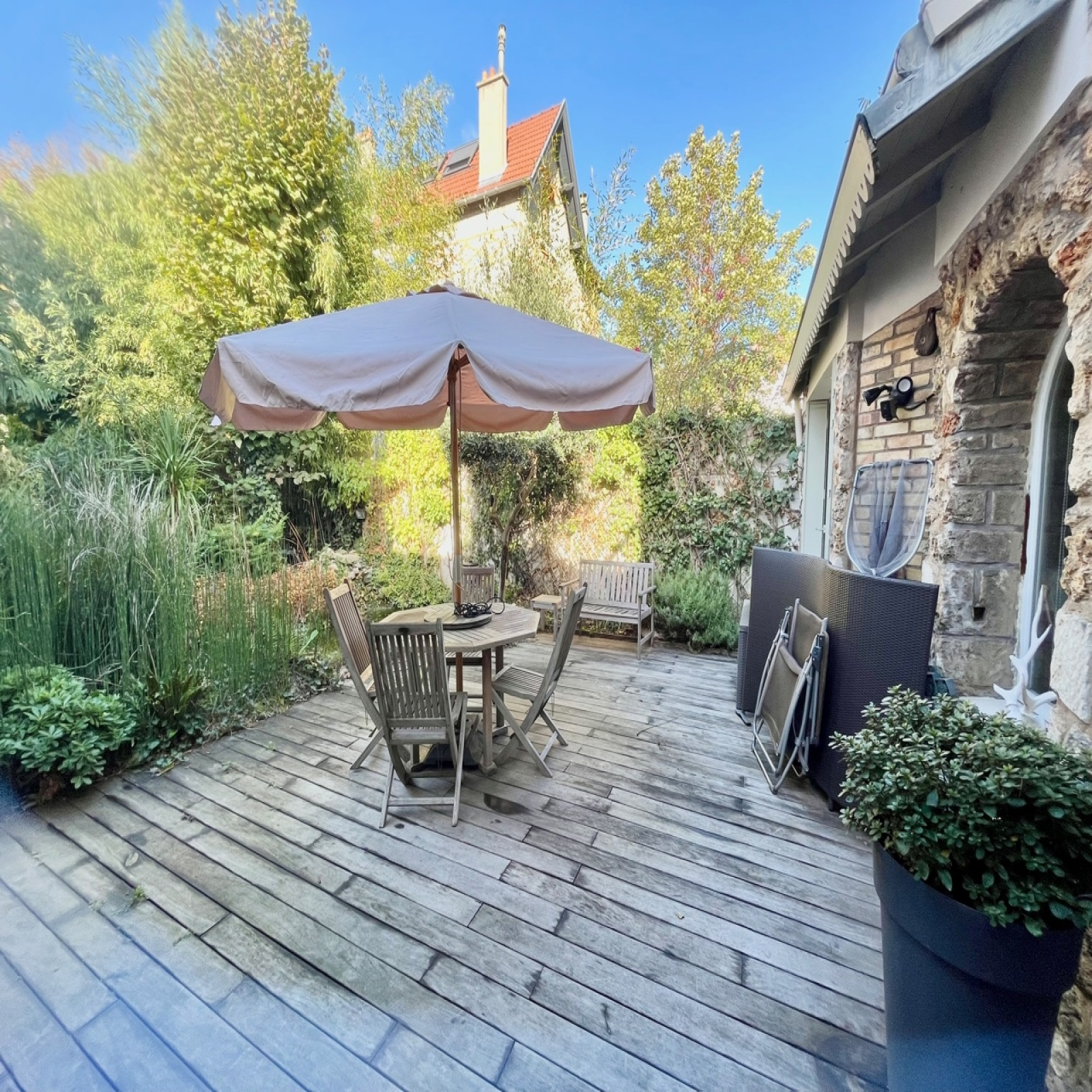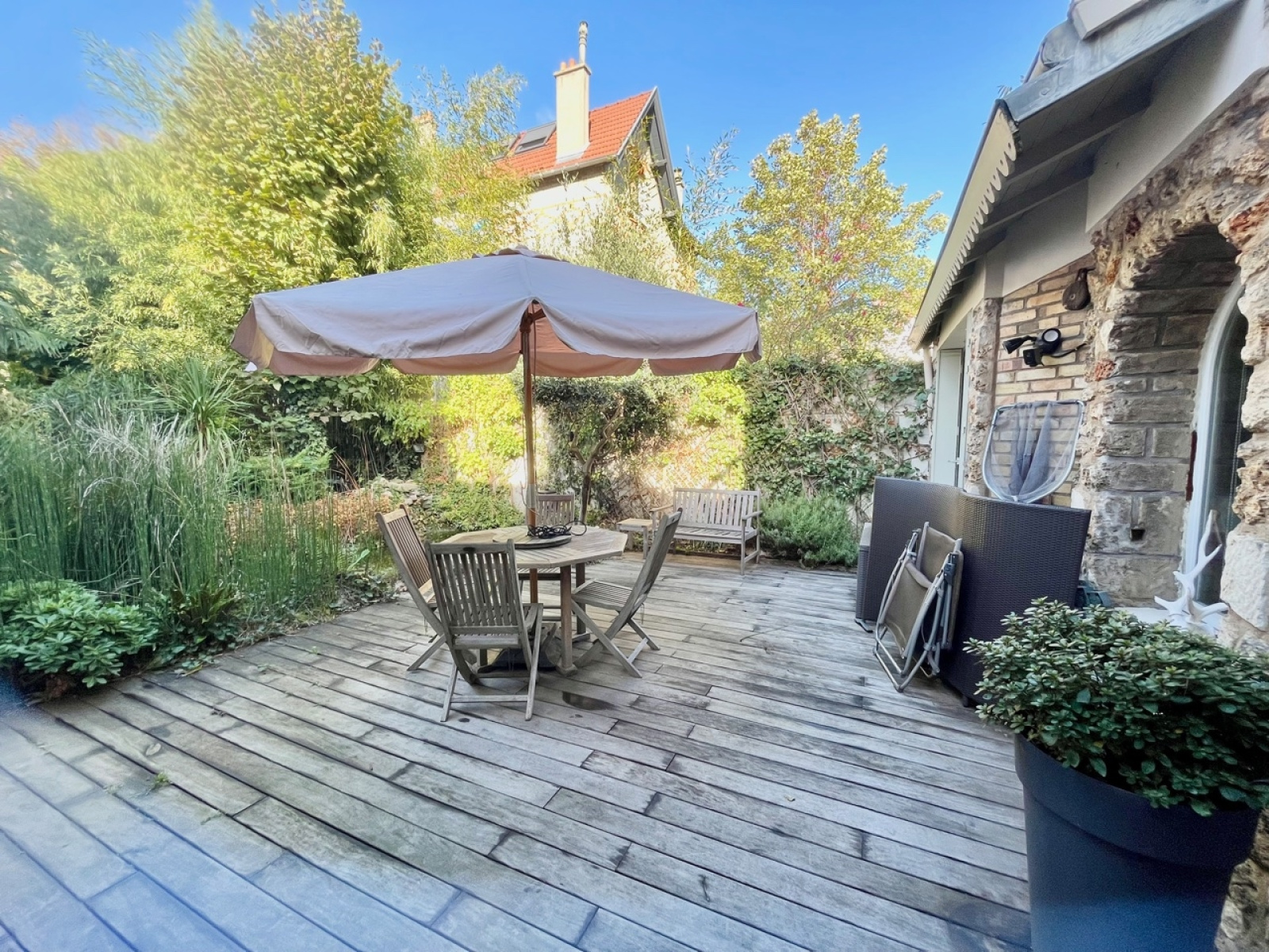 LES VALLEES. A proximité immédiate de la gare et des commerces. Située dans un écrin de verdure, magnifique maison de 163 m2 alliant le charme de l?ancien et une rénovation contemporaine, plus une dépendance de 15 m2 sur un terrain de 456 m2. Offrant de belles prestations (Isolation, ravalement récent, matériaux de qualités, alarme...) et un excellent DPE (C), cette maison offre au rez-de-chaussée un plateau de 93 M2 de plain-pied, composé d'une entrée avec placard, d'un séjour de 50 m2 avec insert, d'une cuisine dinatoire, aménagée et équipée, de 20 m2 et d'un bureau de 13 m2 (possibilité chambre supplémentaire), d'une buanderie et d'un wc indépendant. A l'étage : une magnifique suite parentale avec deux dressings, une salle d'eau et un wc indépendant, 2 chambres dont une avec mezzanine, une salle d'eau avec wc. Un sous-sol partiel offre une chaufferie et des espaces de rangements. La dépendance, aménagée en studio avec kitchenette, salle d'eau et wc permet d'accueillir une jeune fille au pair ou une profession libérale. Cette maison possède un ravissant jardin avec une terrasse de 35 m2 et exposée plein ouest devant la maison et un second jardin à l'arrière. Un garage ouvert, un abri à vélos et un abri de jardin complètent ce bien rare, qui séduira une famille souhaitant une maison confortable et sectorisée sur Georges Pompidou et Lakanal. Les prestations, le volume de l'espace de vie et la dépendance font de cette maison un véritable bien coup de coeur ! Votre contact : Caroline Langellier (EI) Agent commercial inscrite au RSAC de Nanterre sous le numéro 829 072 016, joignable au O6.64.19.41.82.