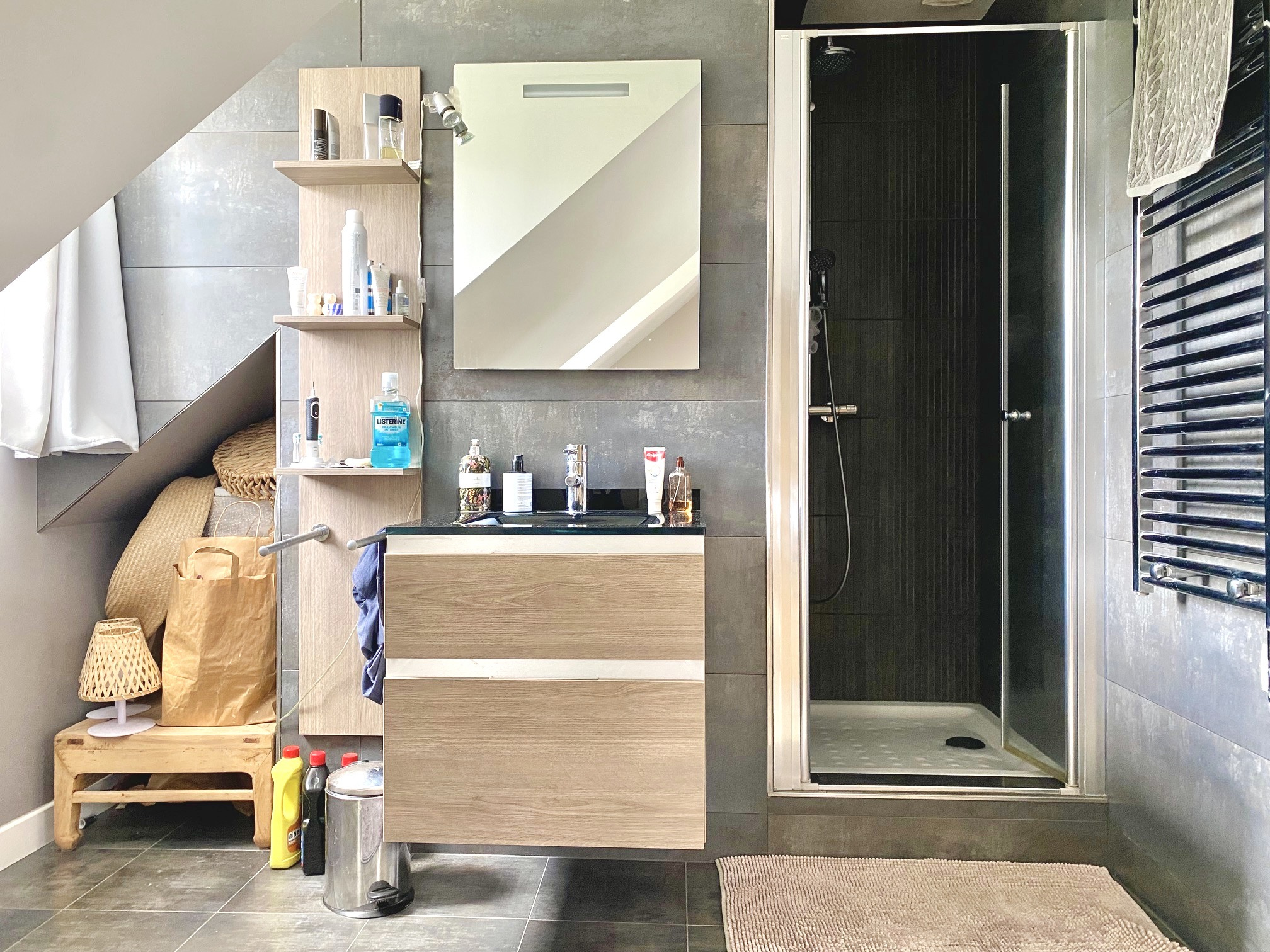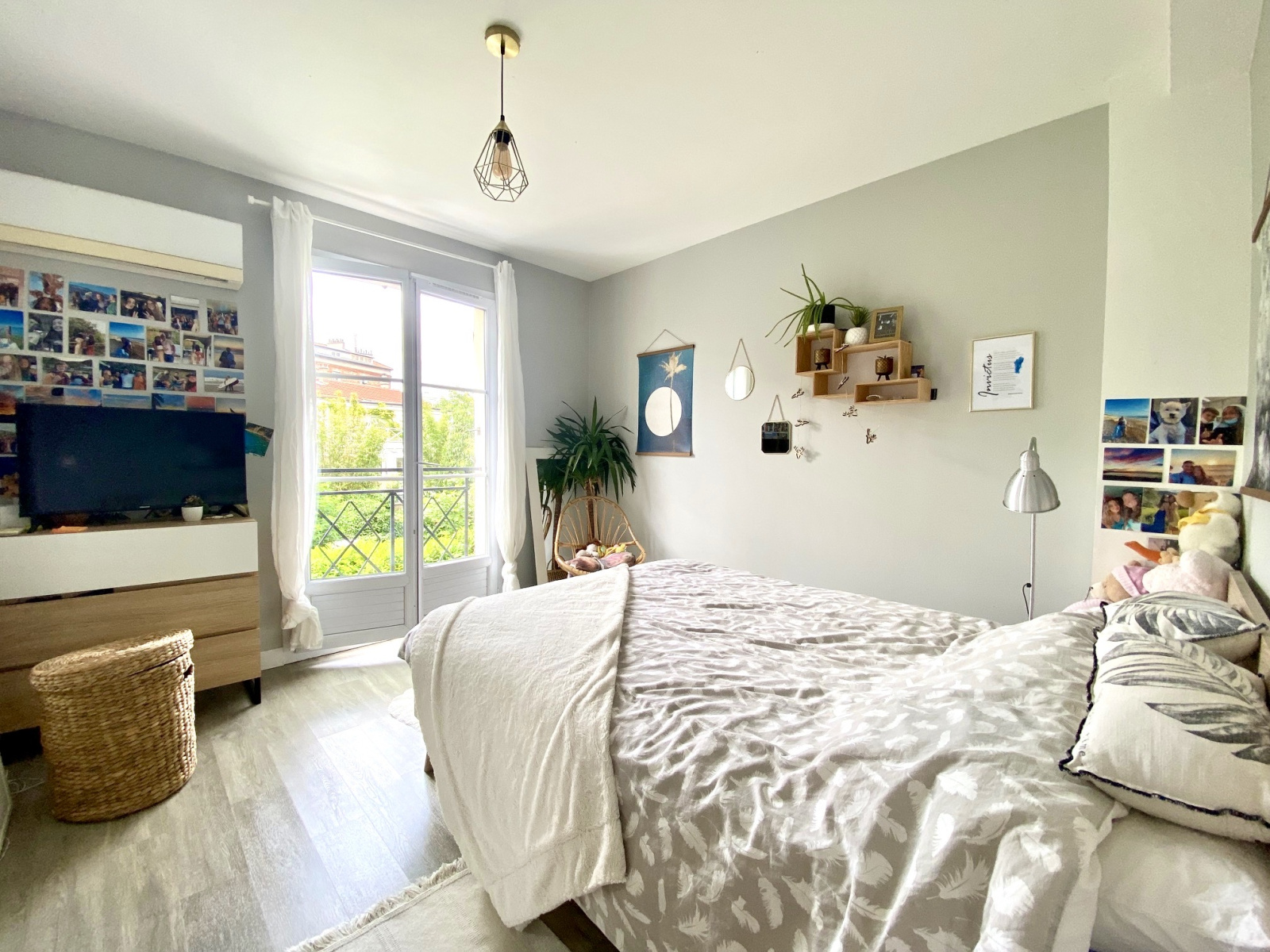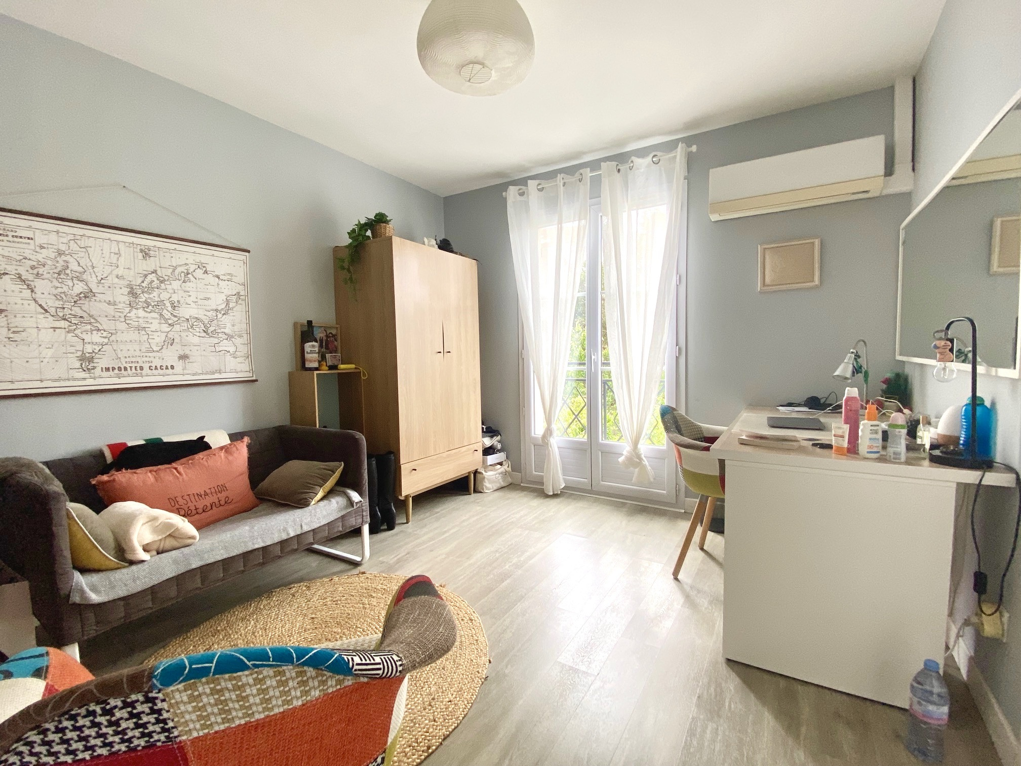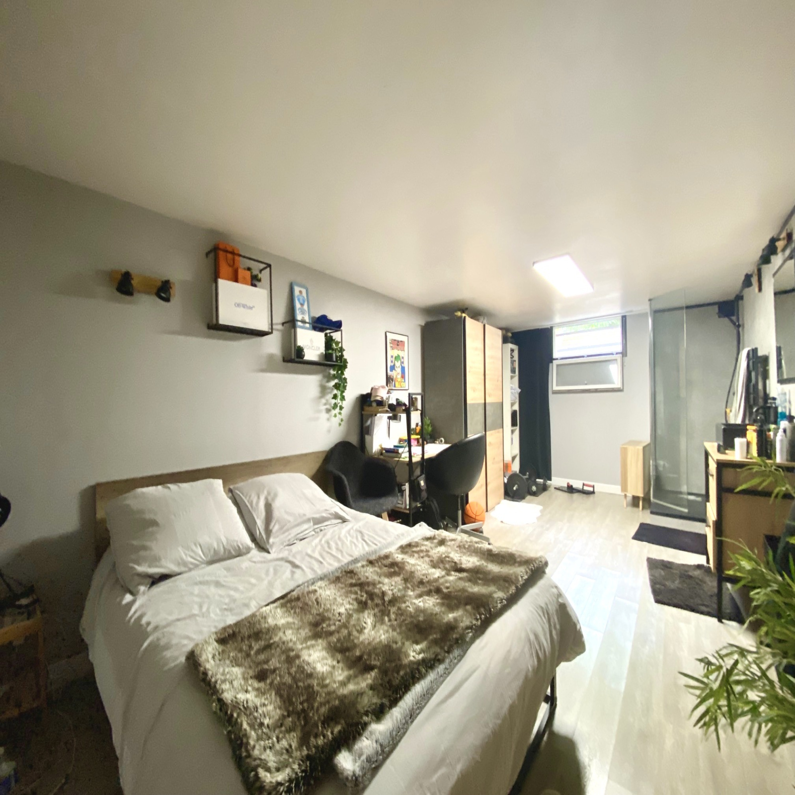 Spacieuse chambre avec belle hauteur sous plafond et salle d'eau.