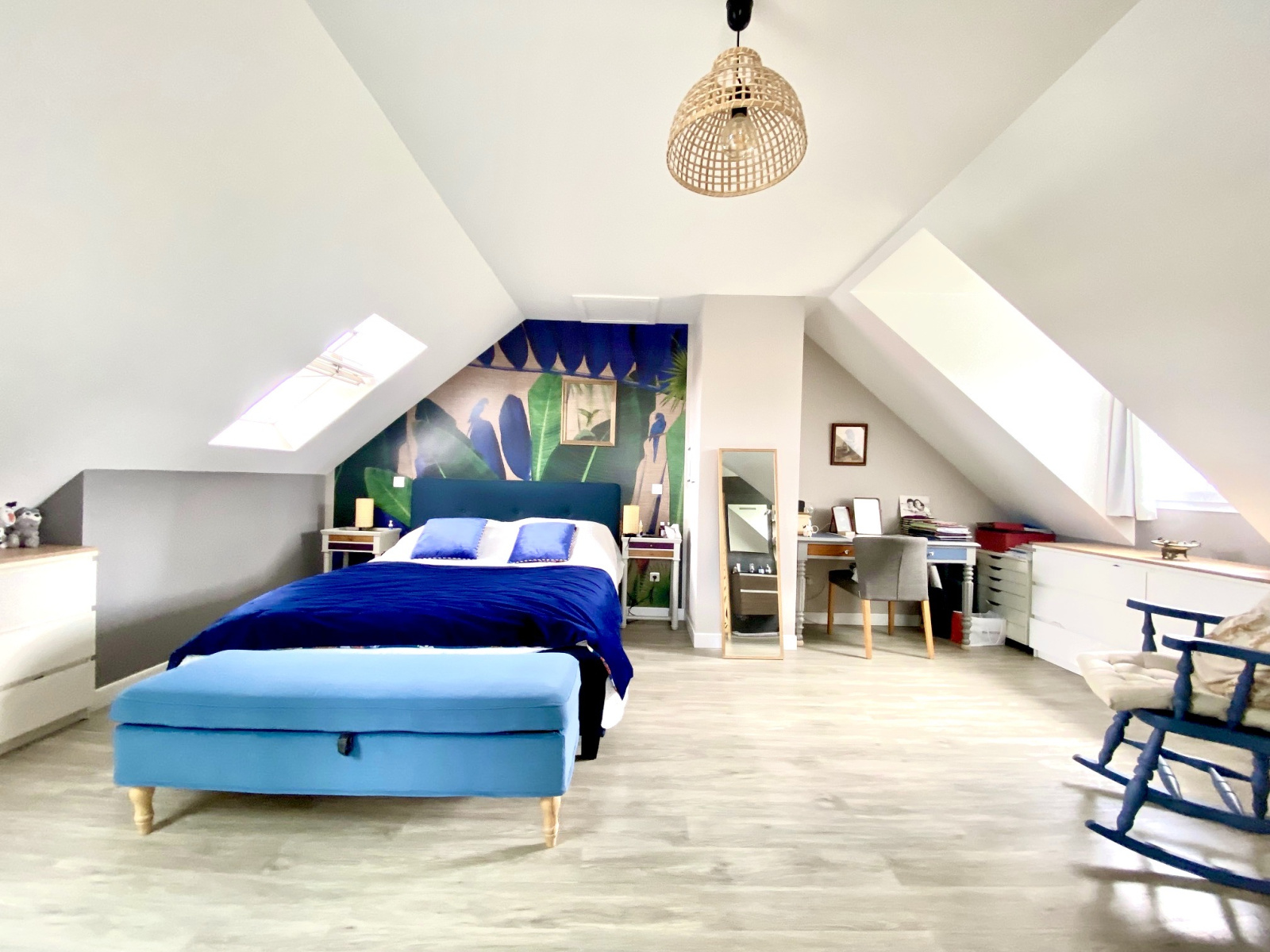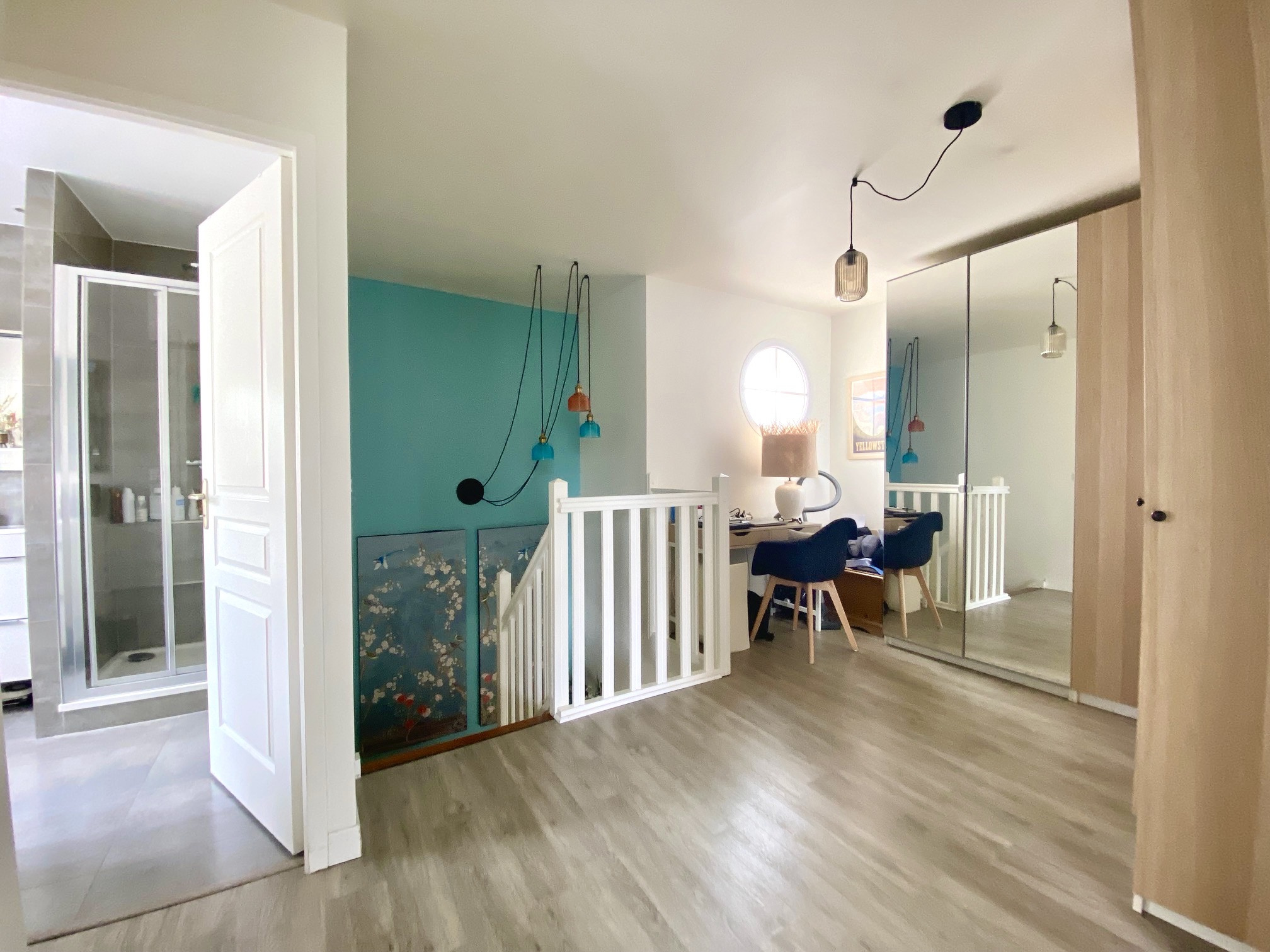 Aux étages, cette maison familiale offre 3 chambres, dont une grande chambre suite avec salle d'eau, un espace bureau, une salle de bains/douche, wc indépendant.