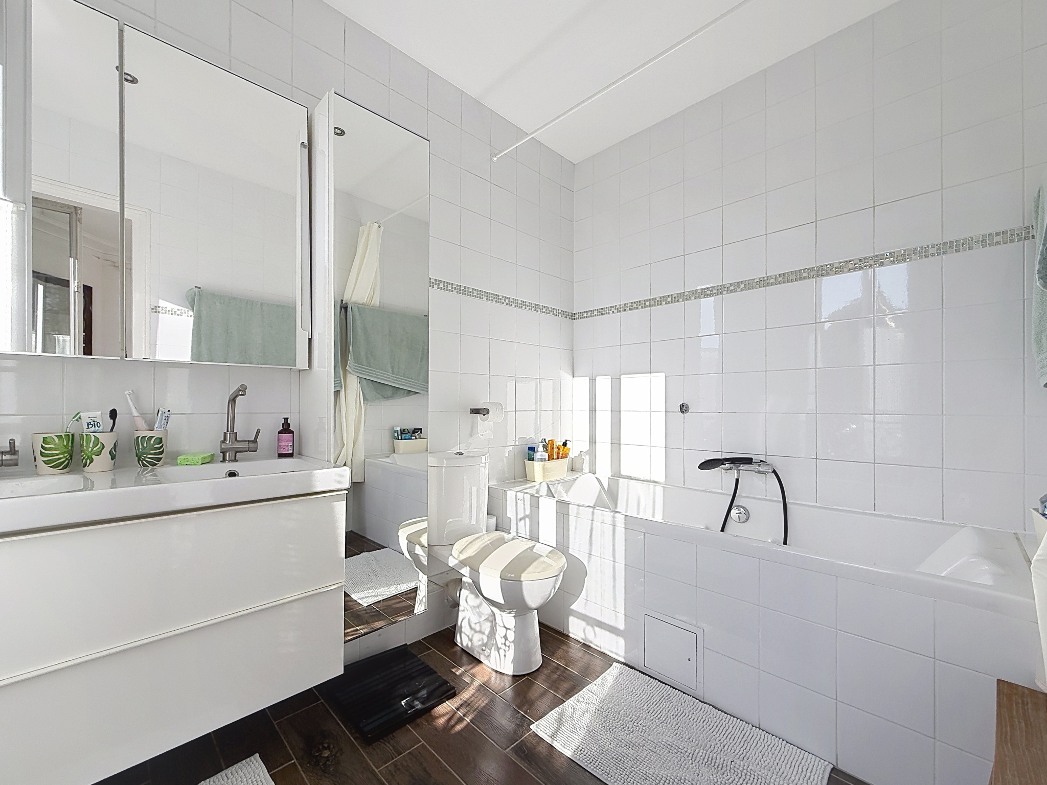 Elle propose au rez-de-chaussée : une entrée, des toilettes invités, une cuisine avec accès direct au jardin, ainsi qu’un agréable double séjour avec cheminée, traversant Est/Ouest, offrant une belle luminosité tout au long de la journée.